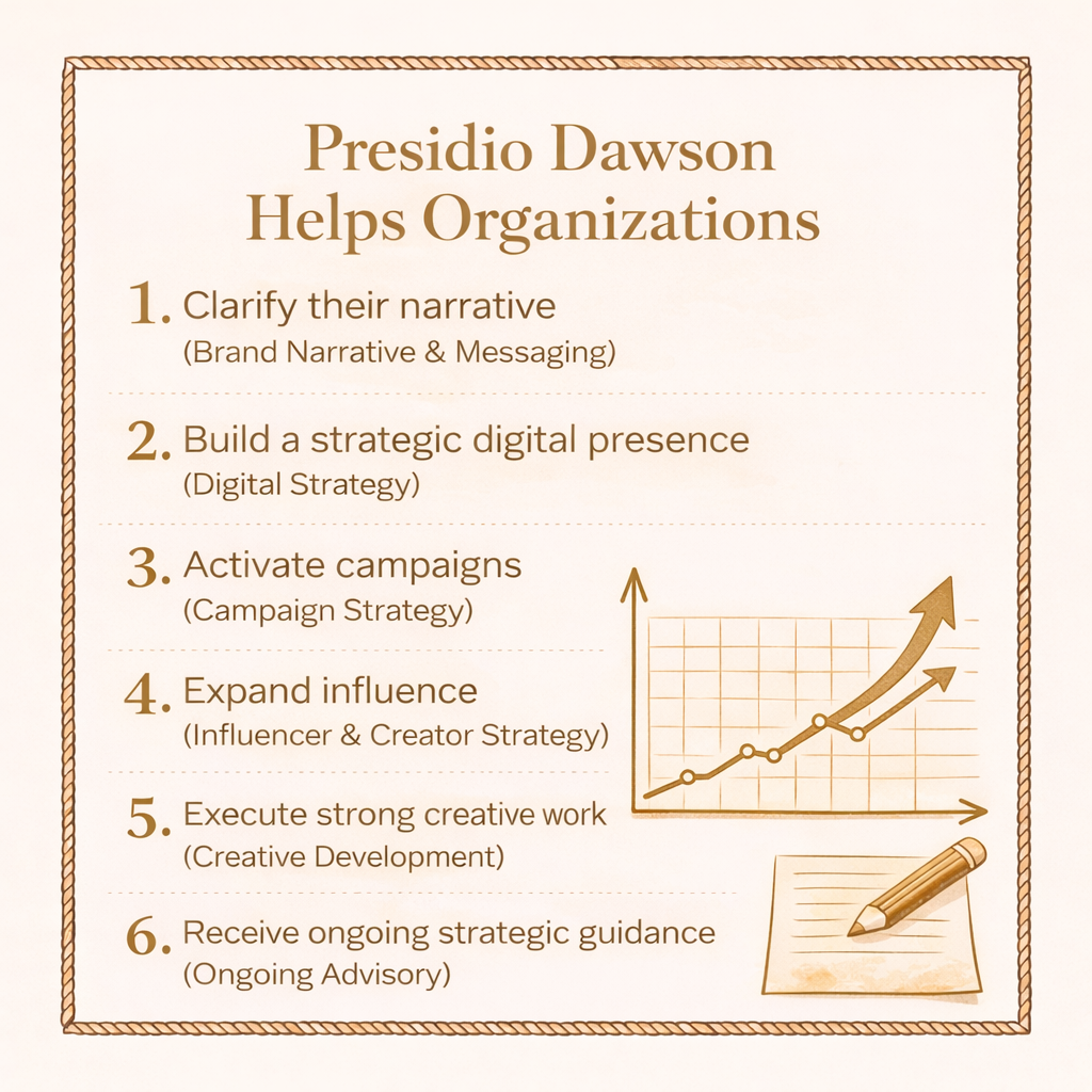Carolina Thomas, founder of Presidio Dawson LLC, is a digital marketing and social media strategist with more than 15 years of experience helping global brands and mission-driven organizations connect with audiences and grow their digital presence. Over the course of her career, she has led social media and digital campaigns for major institutions and consumer brands, translating complex ideas into content that reaches and resonates with millions of people.