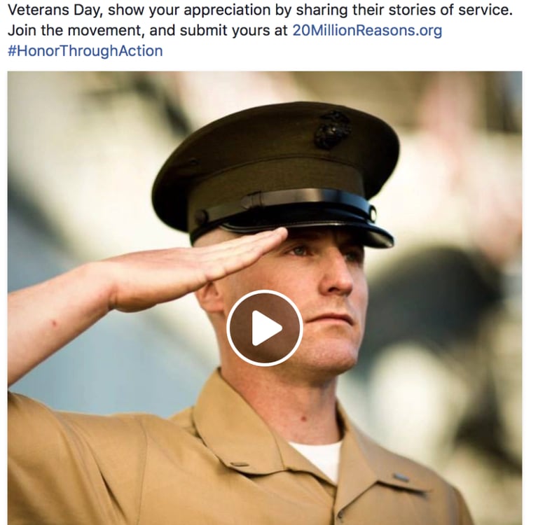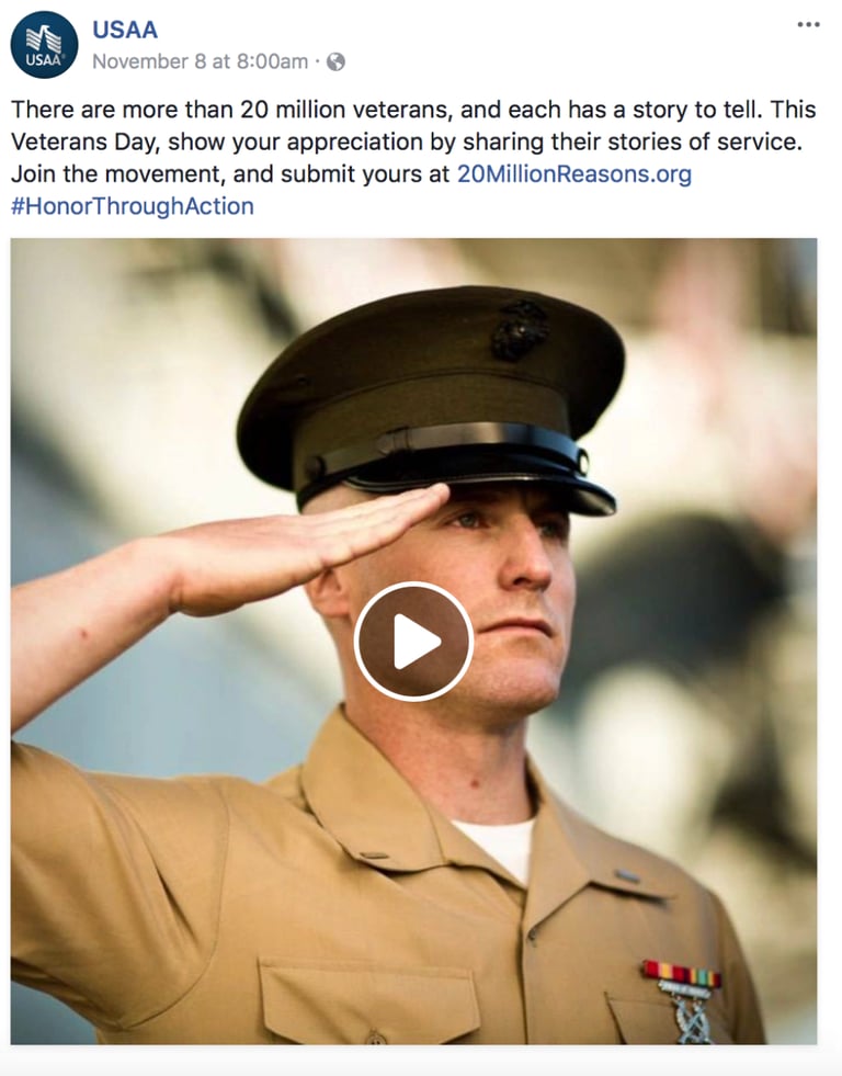 USAA's 20millionreasons.org campaign received 379M impressions and saw a significant lift in Ad Recall, Brand Favorability, and Recommendation in Facebook Brand Effect Study.
